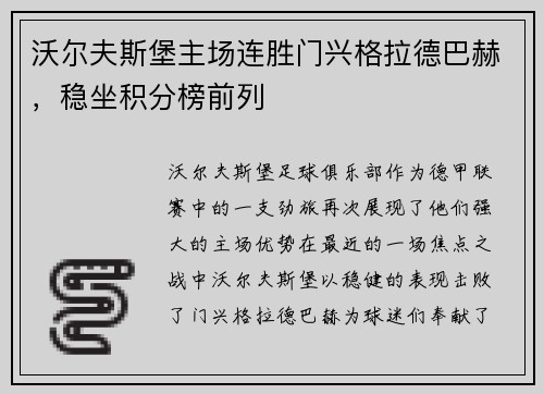 沃尔夫斯堡主场连胜门兴格拉德巴赫,稳坐积分榜前列
